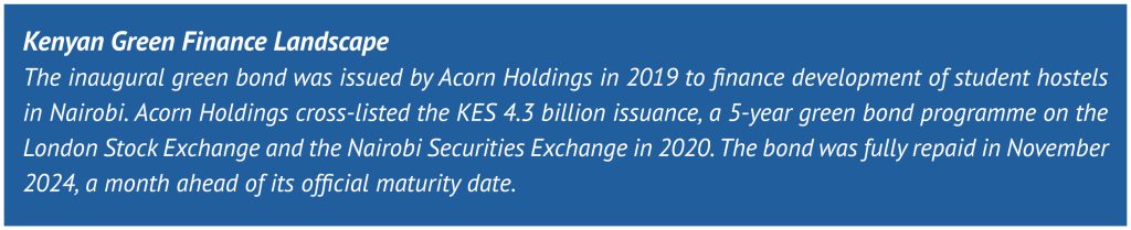 Despite the capital markets offering an avenue for long-term local currency funding and domestic resource mobilisation, it remains largely underutilized as sustainable finance capital inflow in Kenya has been supported by several external sources including Development Finance Institutions (e.g. International Finance Corporation, European Investment Bank and Africa Development Bank), Multilateral Development Banks (MDBs), Multilateral Climate Funds (like the Green Climate Fund and Global Environment Facility), as well as government contributions and private sector players. Over the last five years, six public bonds have been issued in the Kenyan capital market, with only one being a green bond, a telling indicator that this avenue for capital raising remains untapped. While we recognise that multiple private and bilateral green financing transactions have occurred in the Kenyan market over the same period, we note that one prominent private green note issuance from Burn Manufacturing USA LLC (Kenya Branch) occurred in October 2023 for financing clean cookstoves across Sub-Saharan Africa.